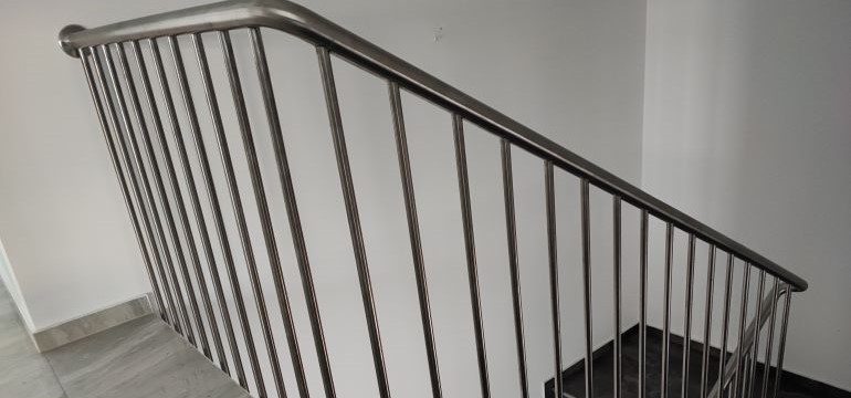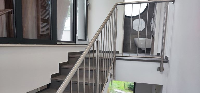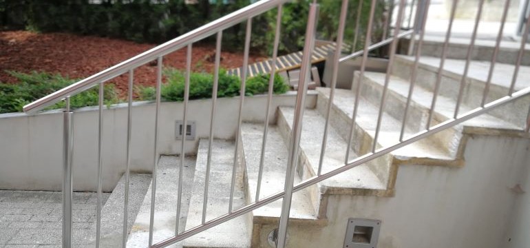 Inox ograda za stepenice iz okruglih profila. Rukohvat i stupovi inox okrugli profili promjera 40 ili 50 mm te 42,4mm u mat-satiniranoj varijanti donja horizontala je inox okrugli profil promjera 25 ili 30 mm. OKomite ispune okruglih profila 16mm idu od donje horizontale pa sve do rukohvata.